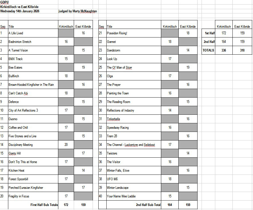 In our first match in the Glasgow District Photographic Union competition on 14th January, we came out on top against East Kilbride Camera Club by 336 to 318 points.
